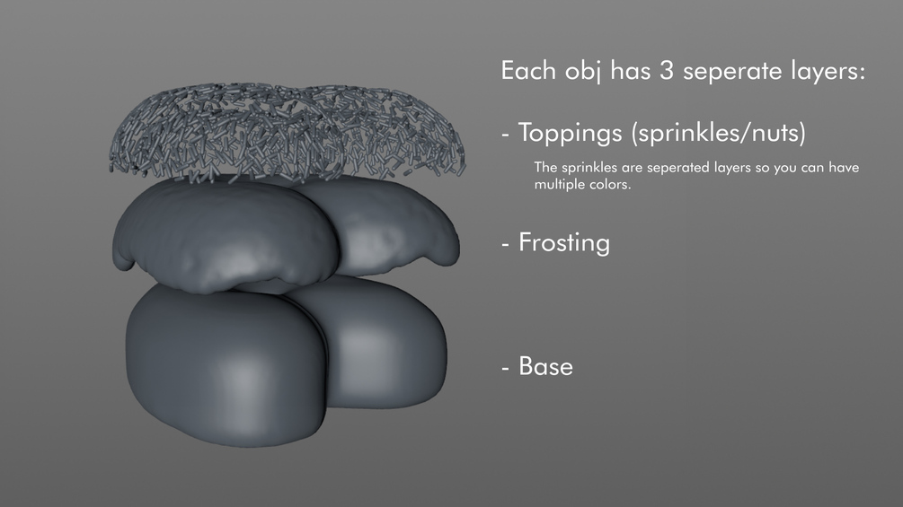 - The sprinkles are individual layers so you can make them multi-colored easily.